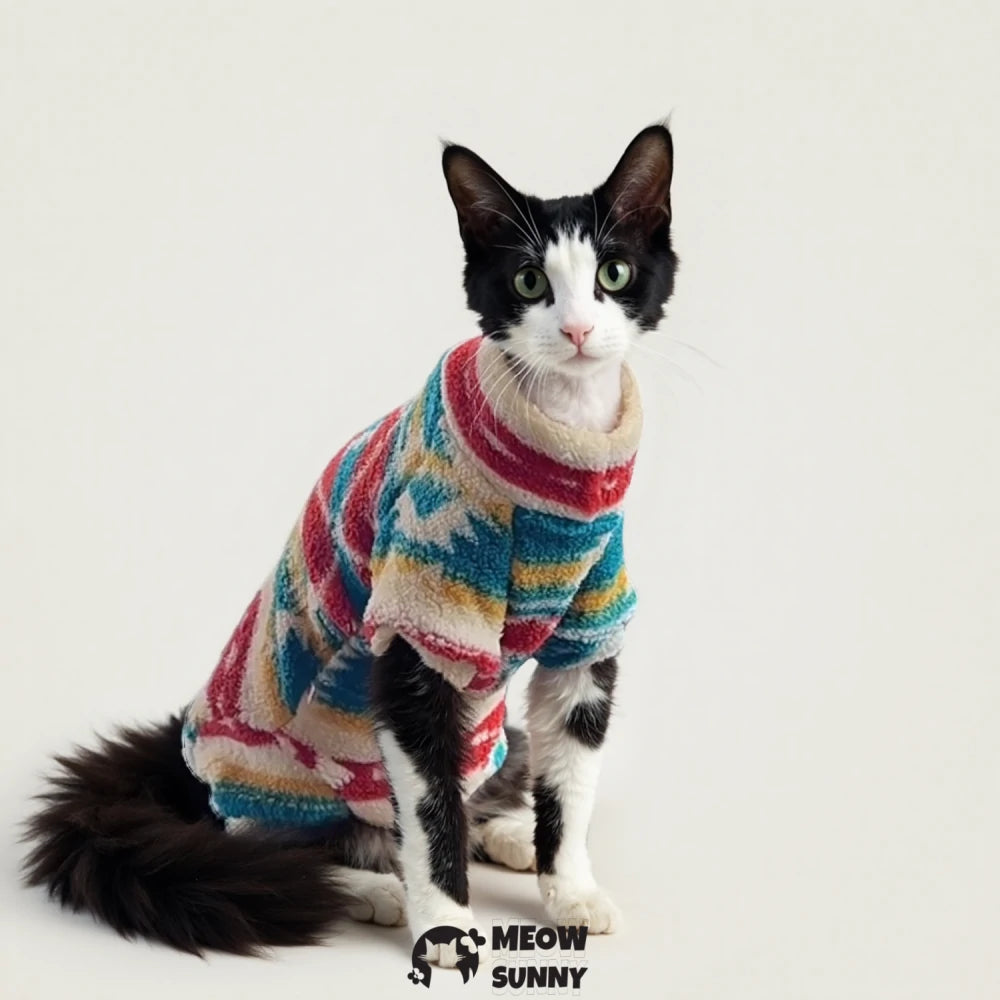 Layer up your hairless cat in ultimate winter comfort! This thickened fleece base layer combines practical warmth with vibrant, colorful printed design. The stretchy fabric moves with your Sphynx, providing a snug fit that doesn't restrict movement while protecting delicate, sensitive skin. Perfect as a standalone piece or layered under other outfits, this versatile shirt keeps your hairless friend cozy all season long. Your cat will stay warm, look fabulous, and feel absolutely pampered!