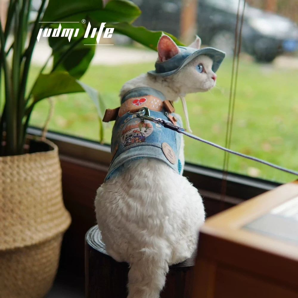 Dress up your cat in this adorable denim chest leash set complete with a matching hat! Perfect for playful outings, this set combines style and safety, letting your furry friend explore comfortably while looking irresistibly cute. The denim material adds a trendy touch, making every walk a fun fashion statement.