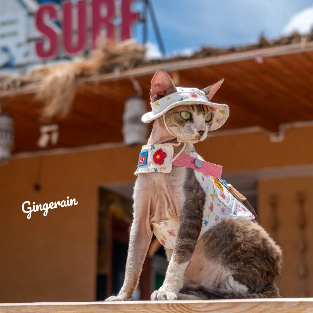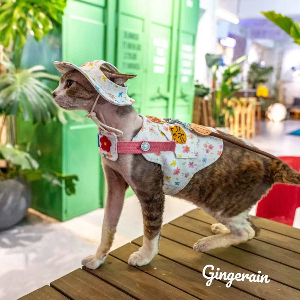 Dress your cat in this playful white floral chest strap set, featuring charming cartoon patches and a matching hat. Designed for comfort and style, it keeps your furry friend cozy while adding a fun, whimsical touch to their look. Perfect for everyday adventures or special moments together.