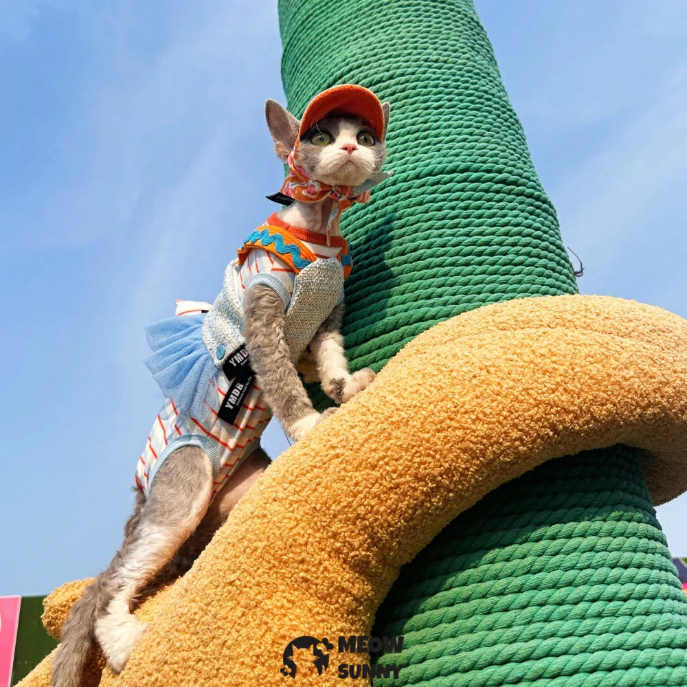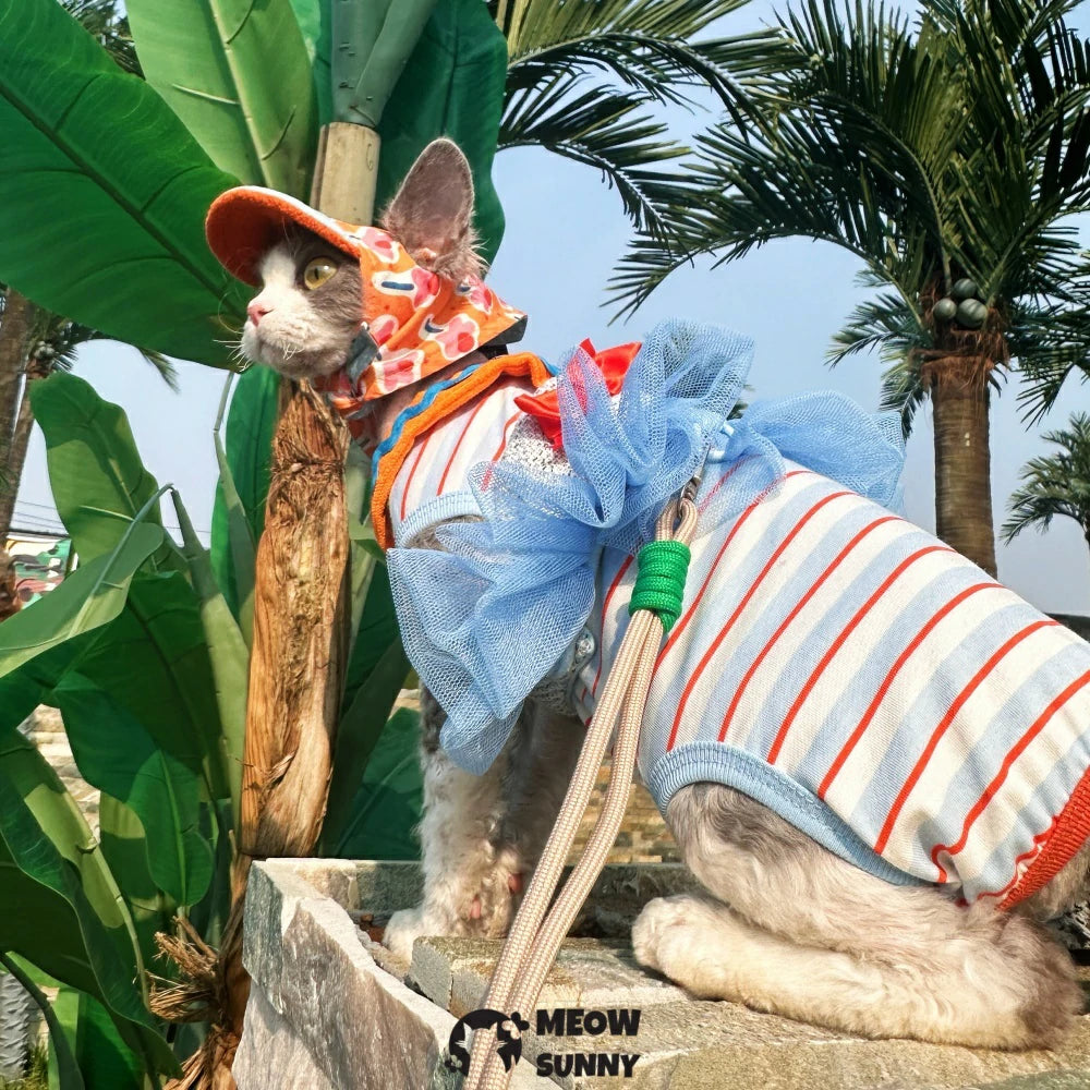 Dress your hairless cat in playful retro style with this blue cotton striped vest that offers gentle sunscreen protection. Lightweight and breathable, it keeps your pet comfy while shielding sensitive skin from the sun. Perfect for sunny days, this fun outfit combines fashion and function for your feline friend’s outdoor adventures.