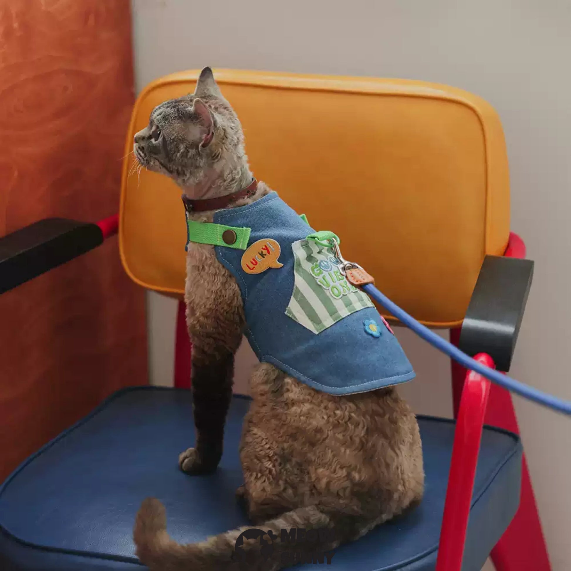 Dress your feline friend in style with this adorable denim cat costume complete with a matching hat! This trendy ensemble isn't just cute—it includes a practical leash and harness set for safe outdoor adventures. Watch your kitty turn heads and collect compliments while staying secure and comfortable in this playful, fashion-forward outfit.