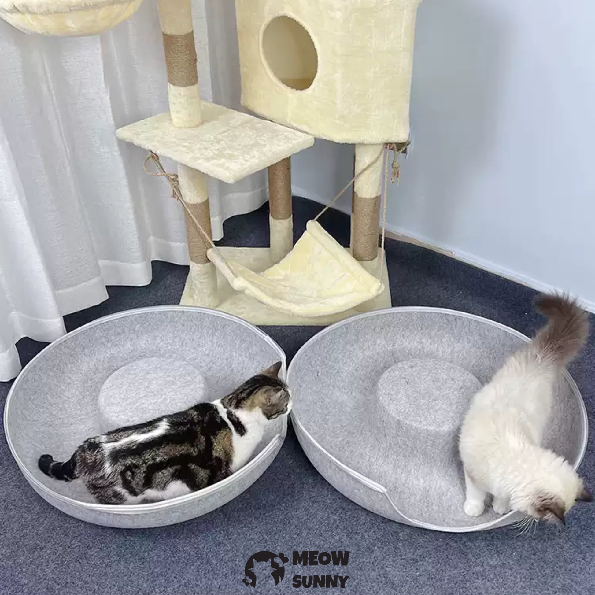 After failing so, so many times to find a place where our cat could feel comfortable when the kids are awake, I finally landed on “the doughnut.” She’s a bigger girl, but even her 14-15 lb frame finds the tunnel cozy and safe. Wish I had landed on this sooner. Cleanabiity/vacuuming could be a little easier but it’s a small price to pay.