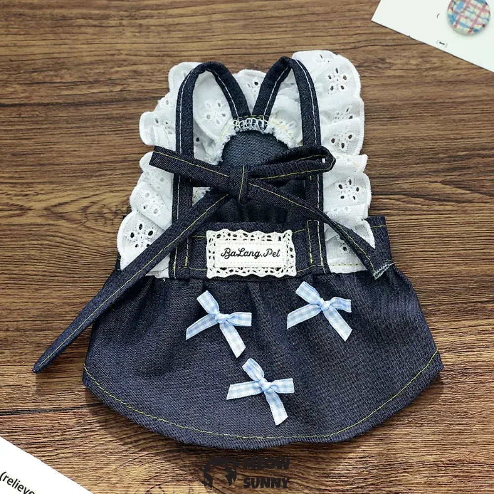 Small dog clothes: bowknot lace denim strap dress, pet clothing